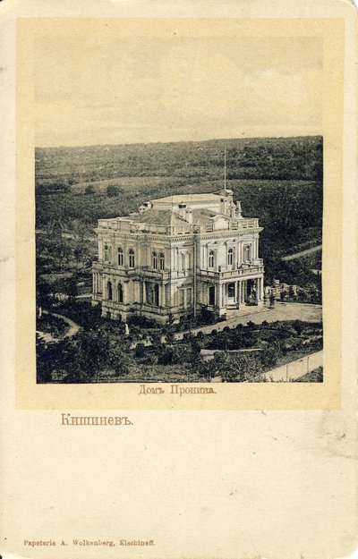 Sursă | Кишинев. Дoм Прoнина: carte poştală. - Kichineff: Papeterie A. Wolkenberg, [1901-1904]. - Alb-negru; 14,1×9 cm. - Necirculată. |